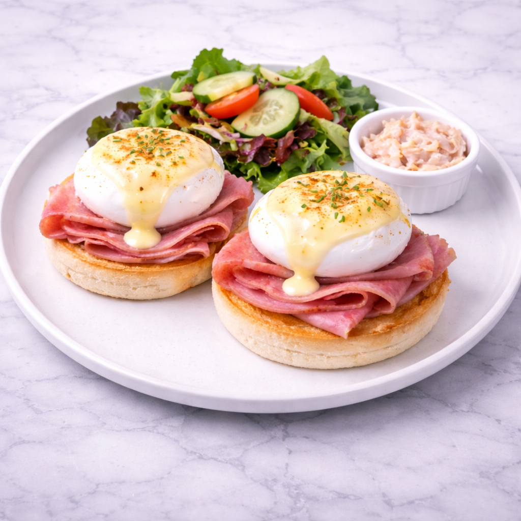 £9.50ham, poached eggs, hollandaise, toasted muffin