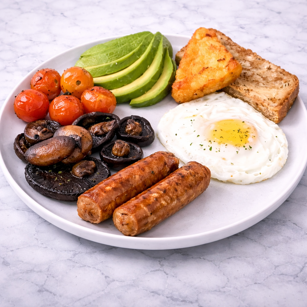 £9.952 sausages, 1 egg, avocado, mushrooms, fresh tomatoes, hash brown, toast
