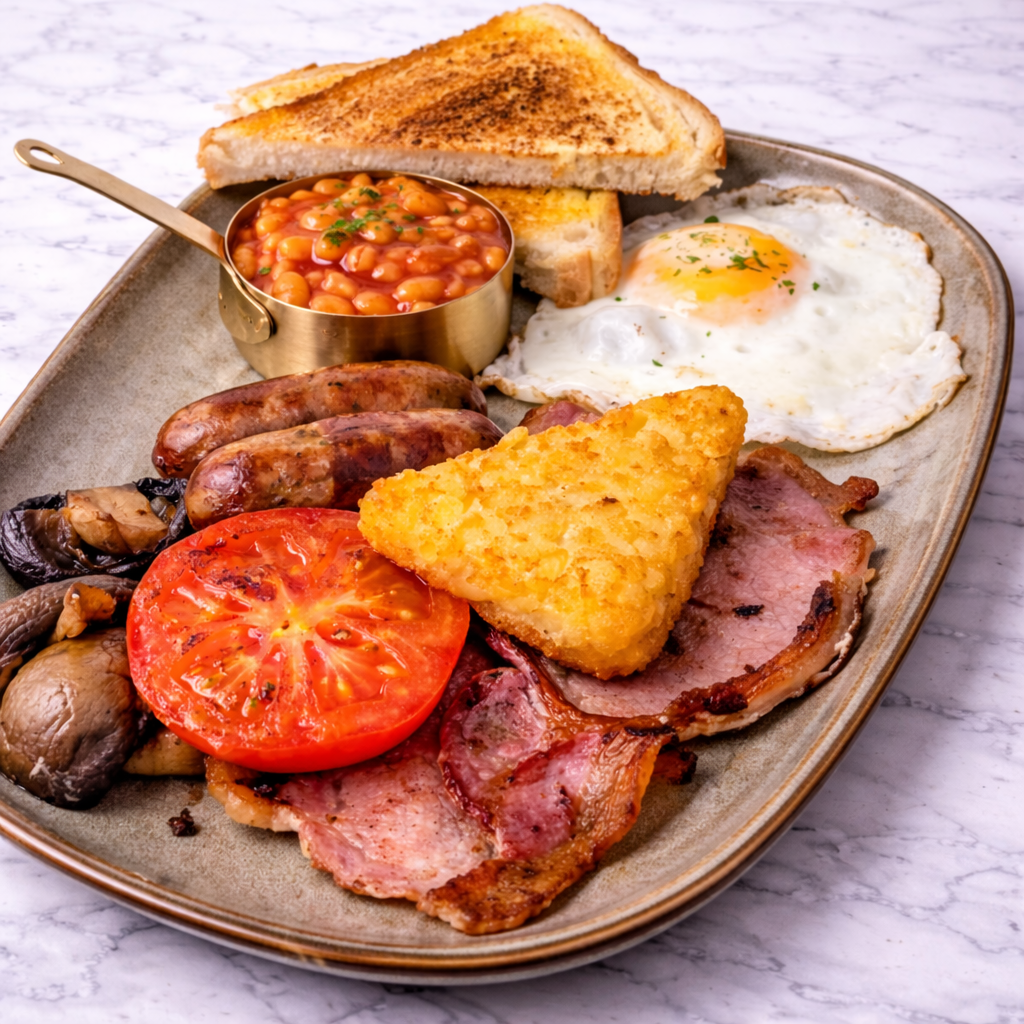 £12.953 sausages, 3 bacon, 2 eggs, 2 hash browns, mushrooms, fresh tomatoes, beans, toast