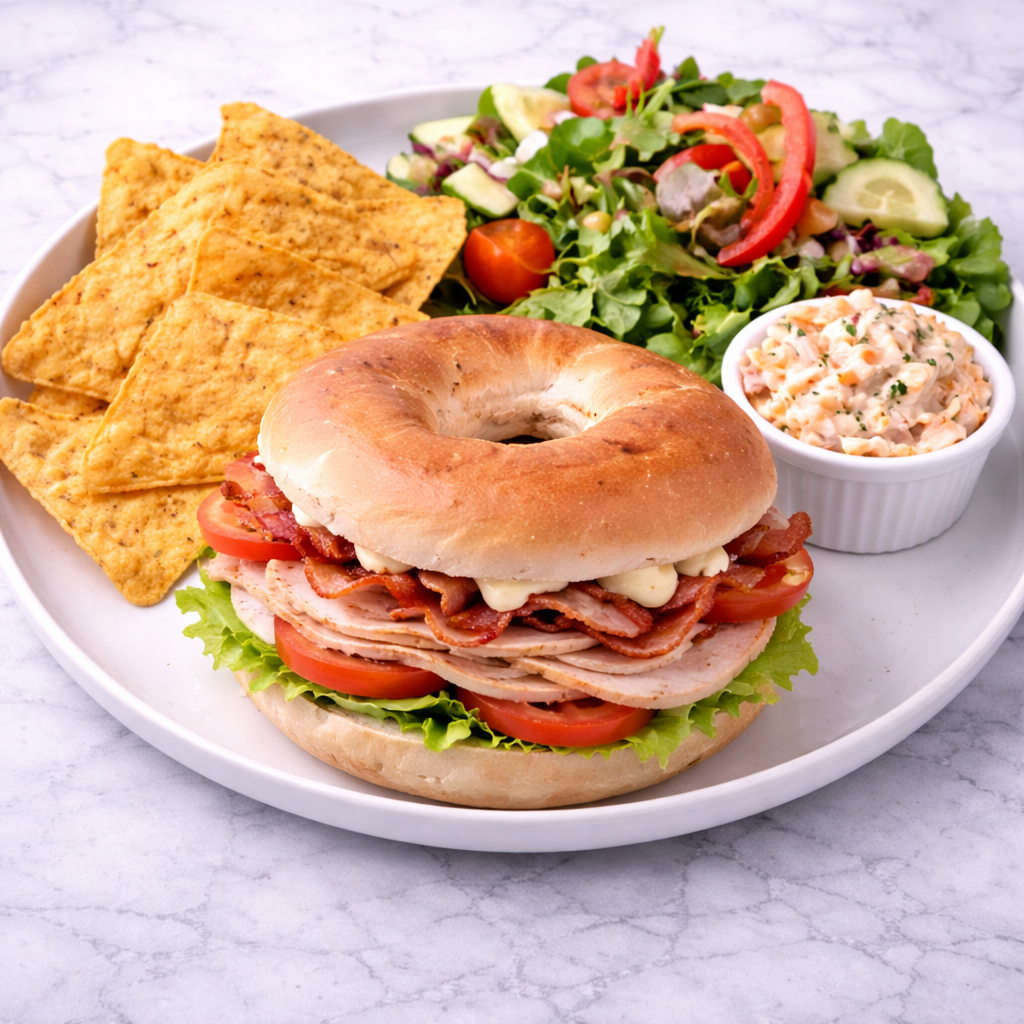 £8.95lightly toasted bagel filled with fresh lettuce, sliced tomato, turkey, bacon, mayonnaise