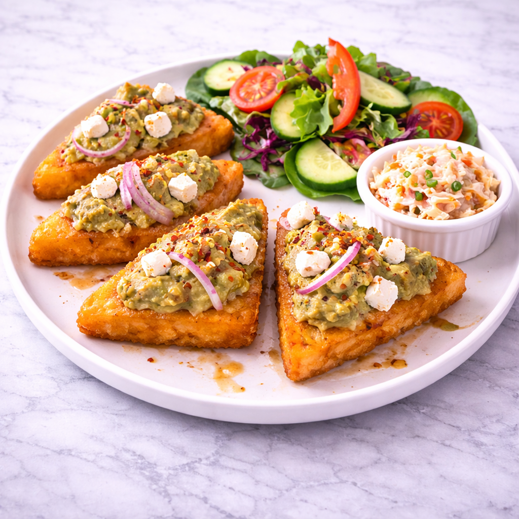 £9.954 hash browns, smashed avocado with chilli and lime, feta, fresh onion, honey (add poached egg or bacon +£1)